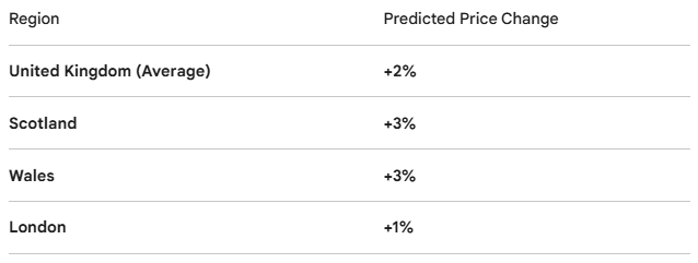 Rightmove forecasts that Scotland, Wales, and northern England will outperform the national average. Better affordability, stronger demand relative to supply, and lower exposure to stamp duty changes all contribute to a healthier outlook in these regions.